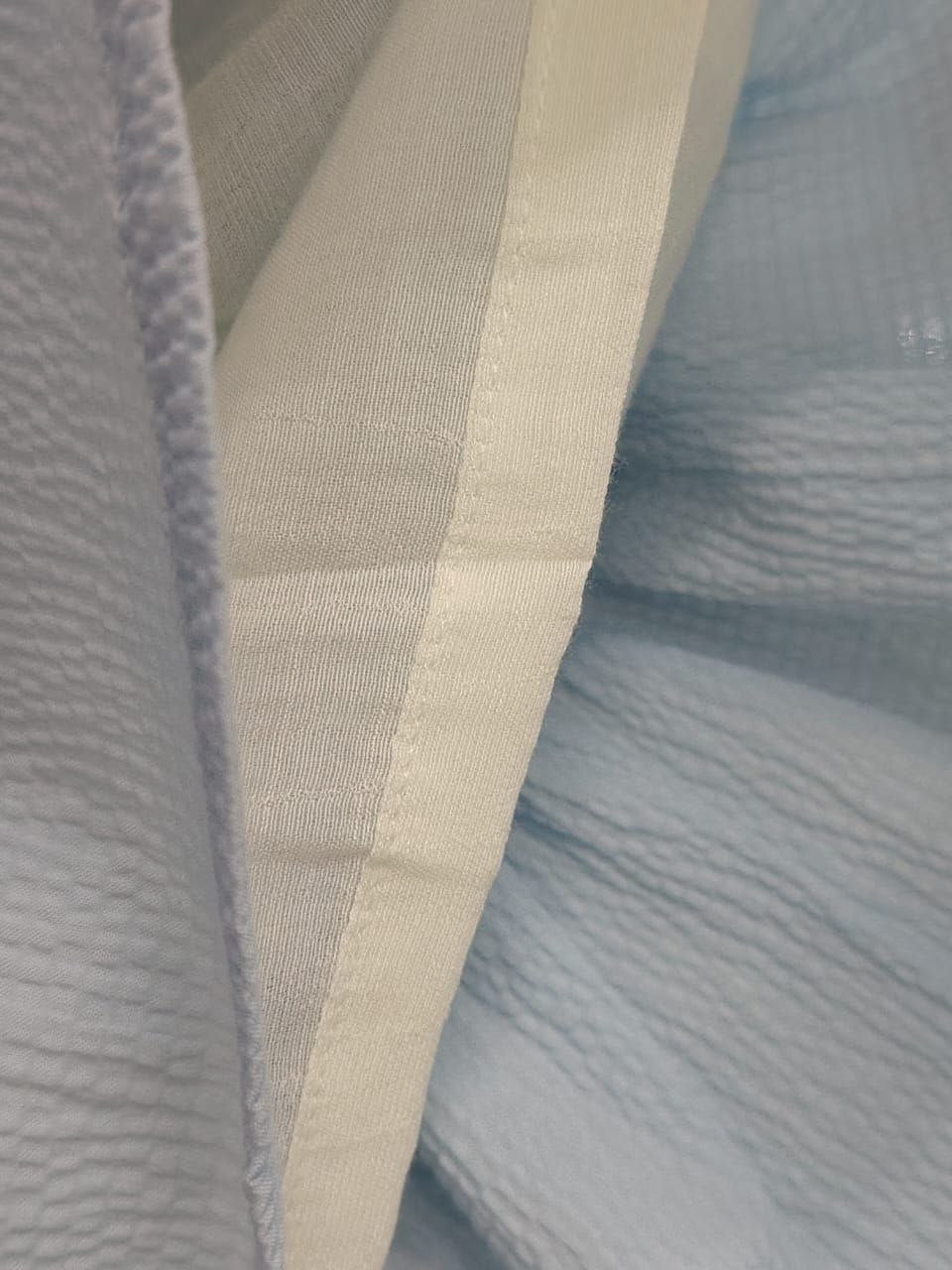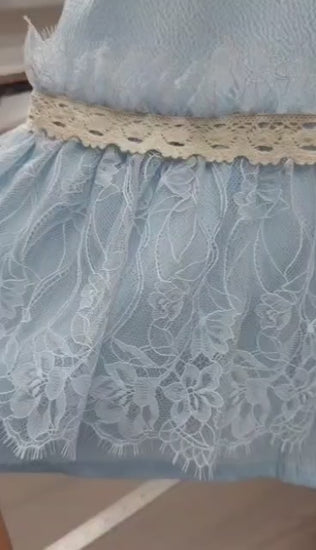 This lovely long skirt is perfect for creating a soft, romantic look. Made from a beautiful baby blue fabric, it features a graceful full-length silhouette with a delicate lace trim and a tiered lace ruffle at the hem. The skirt has a full lining to ensure a smooth, comfortable fit and an elasticated waist for easy wear.